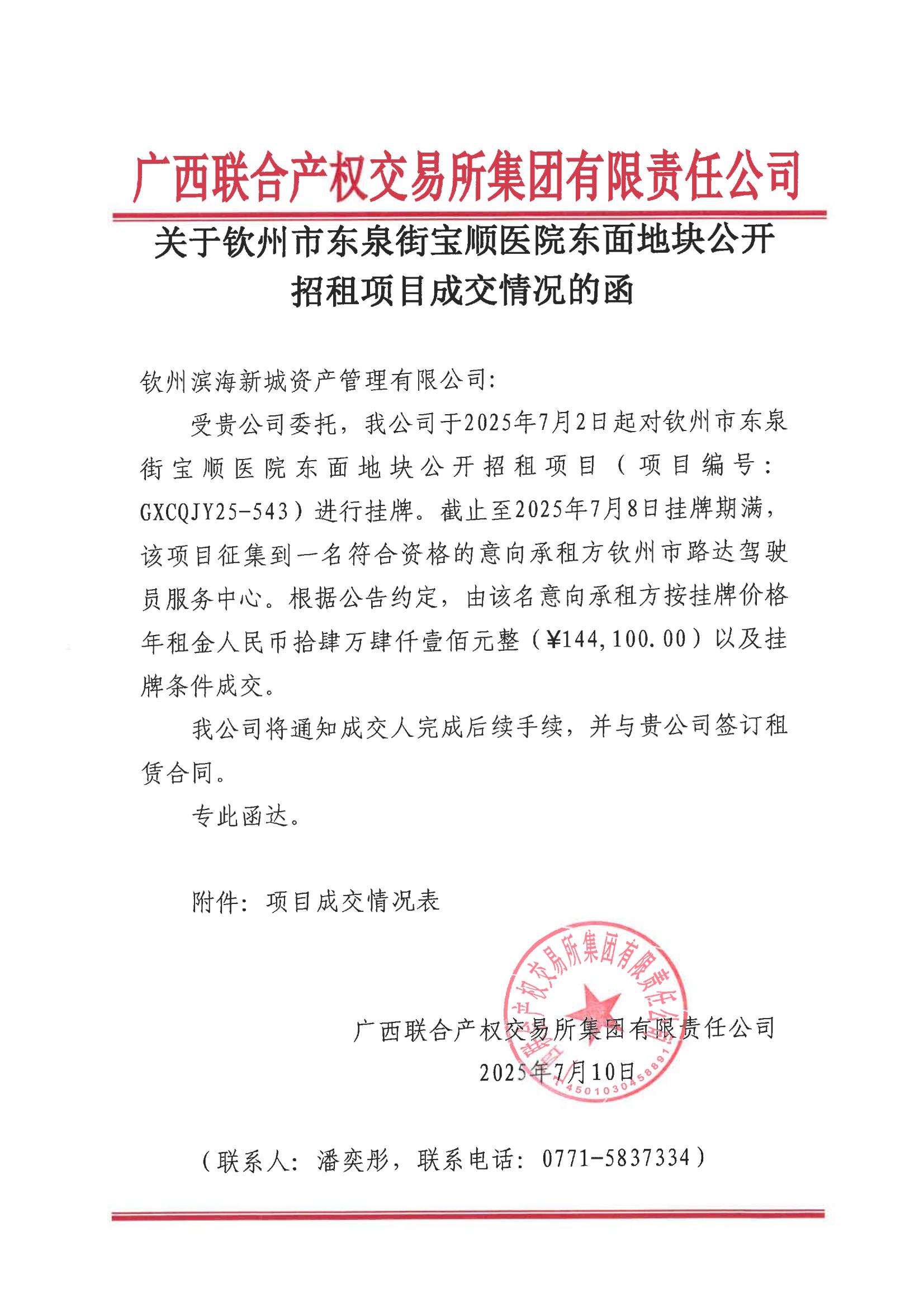 關(guān)于欽州市東泉街寶順醫(yī)院東面地塊公開招租項(xiàng)目成交情況的函