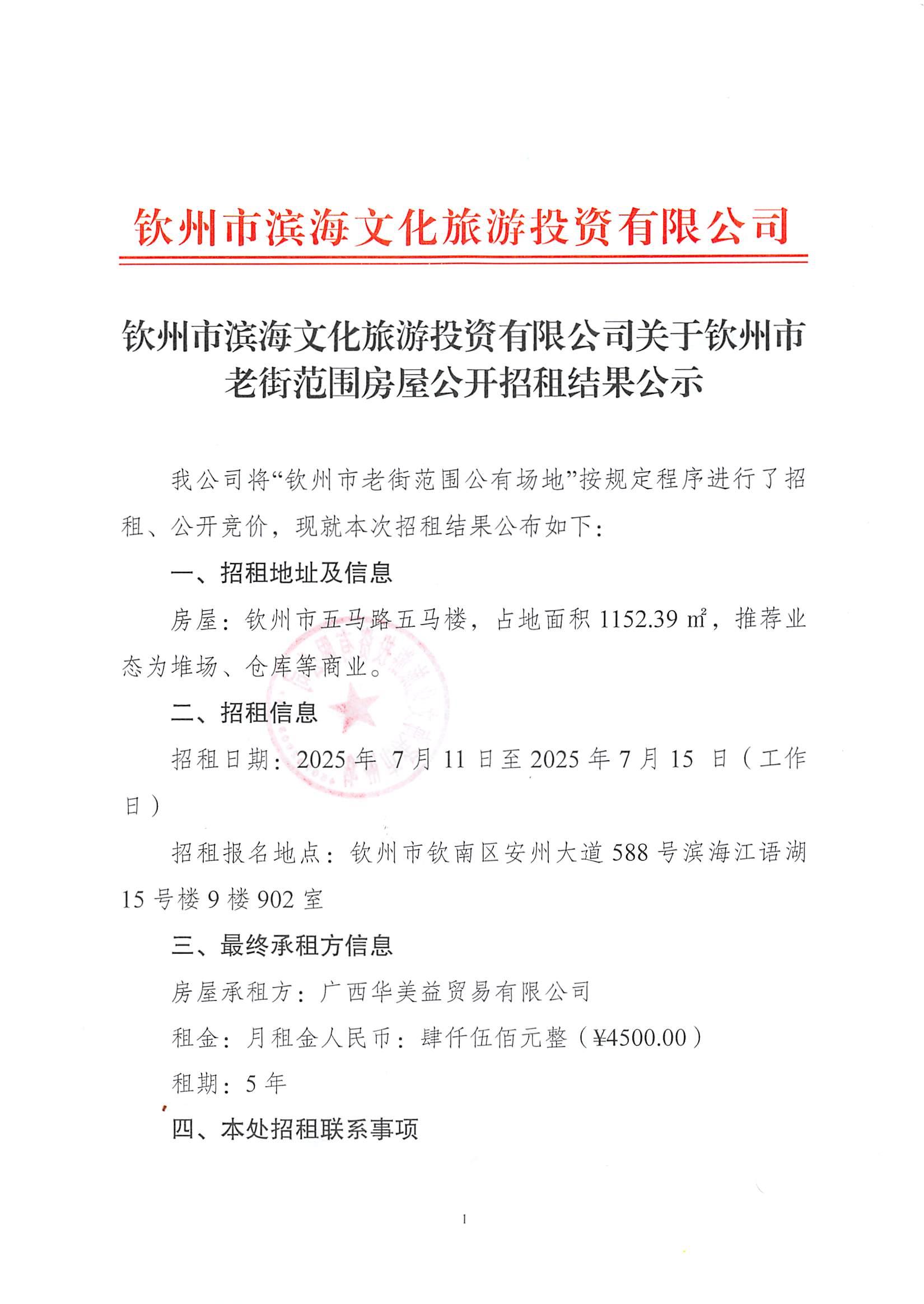 欽州市濱海文化旅游投資有限公司關(guān)于欽州市老街范圍2處房屋公開招租結(jié)果公示