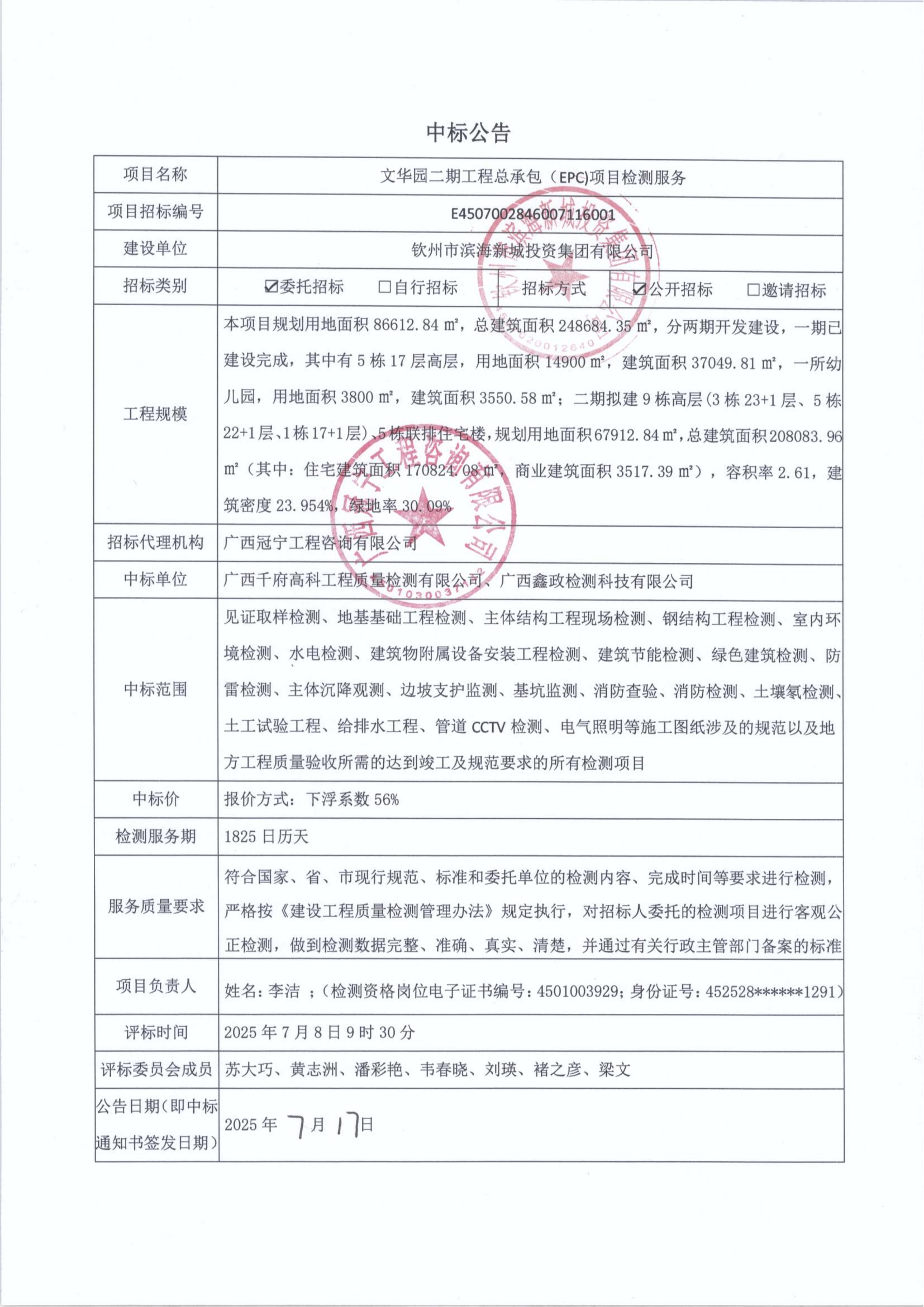 文華園二期工程總承包(EPC)項(xiàng)目檢測服務(wù)中標(biāo)公告