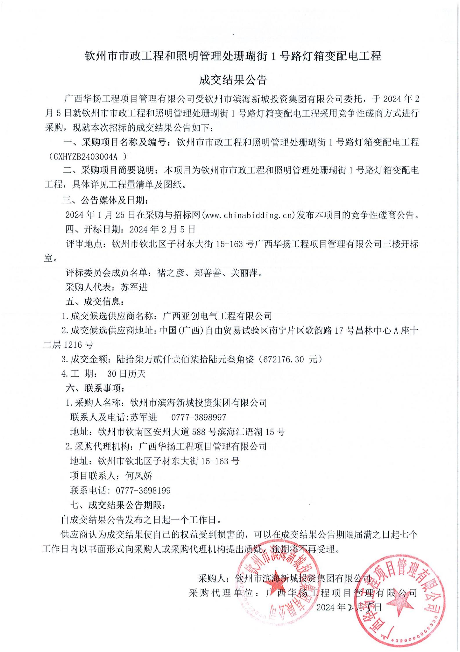 欽州市市政工程和照明管理處珊瑚街1號路燈箱變配電工程成交結果公告