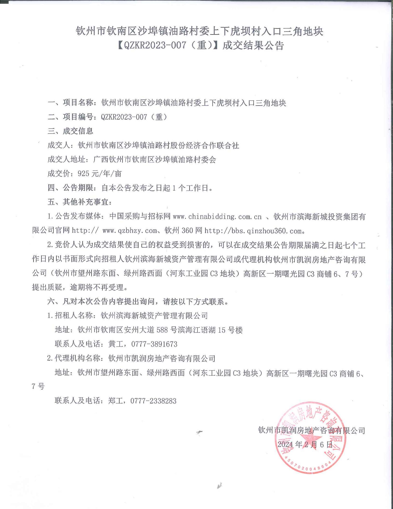 欽州市欽南區(qū)沙埠鎮(zhèn)油路村委上下虎壩村入口三角地塊〔QZKR2023-007(重)〕成交結果公告