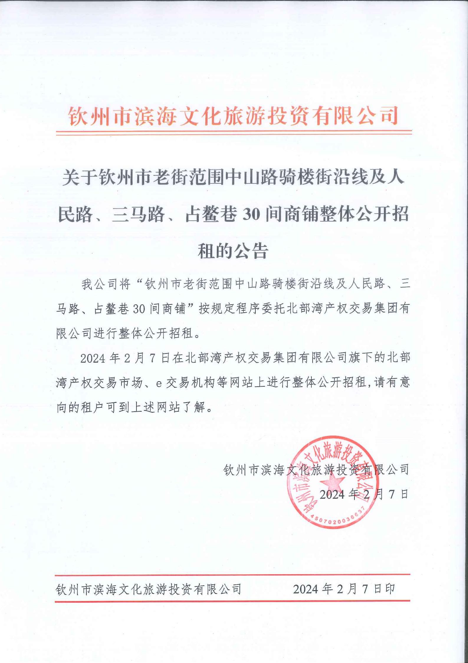 關于欽州市老街范圍中山路騎樓街沿線及人民路、三馬路、占鰲巷30間商鋪整體公開招租的公告