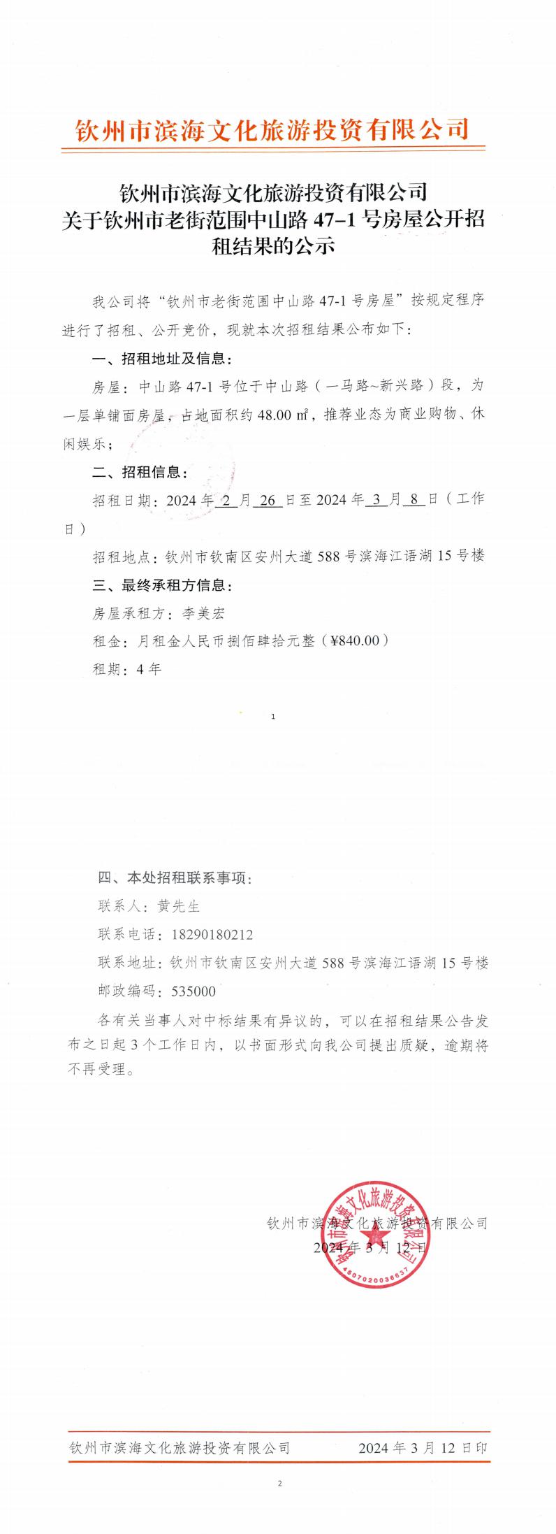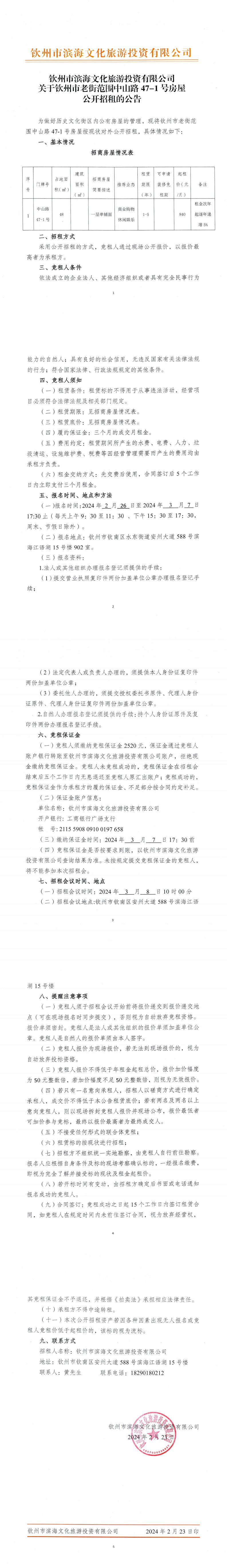 關于欽州市老街范圍中山路47-1號房屋公開招租的公告