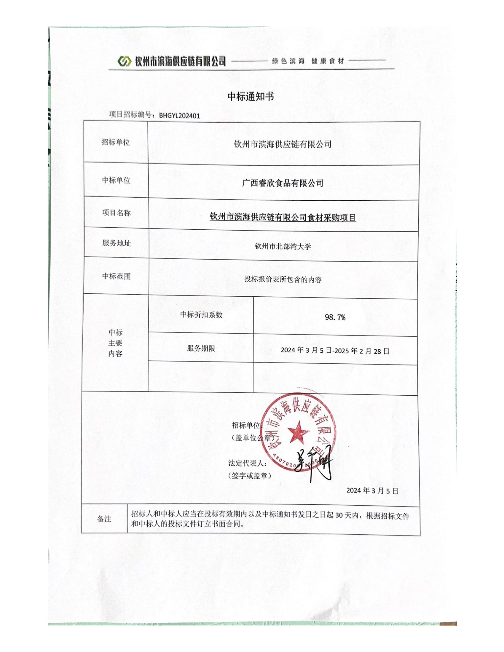 中標通知書(欽州市濱海供應鏈有限公司食材采購項目)