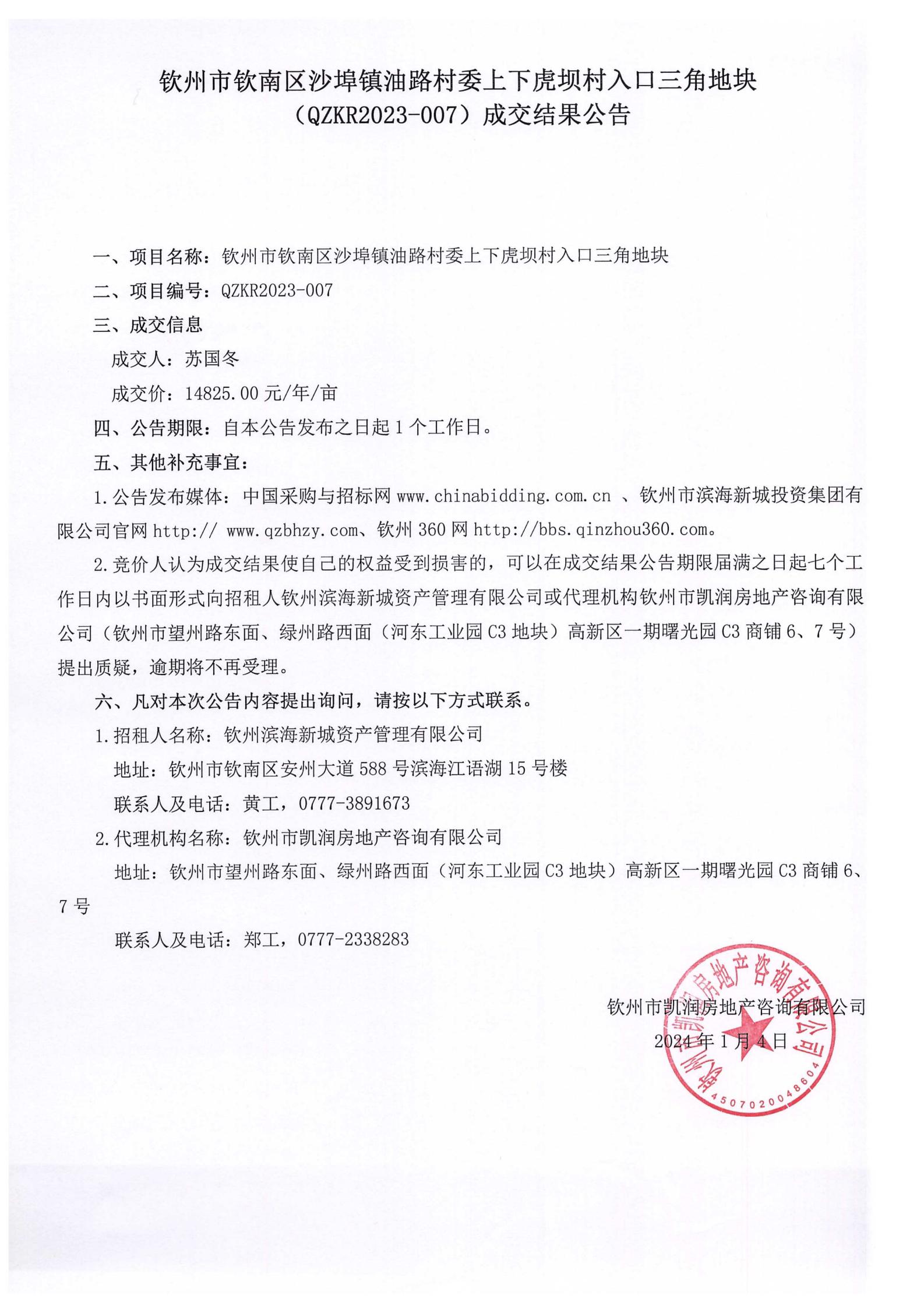 欽州市欽南區(qū)沙埠鎮(zhèn)油路村委上下虎壩村入口三角地塊成交結(jié)果公告