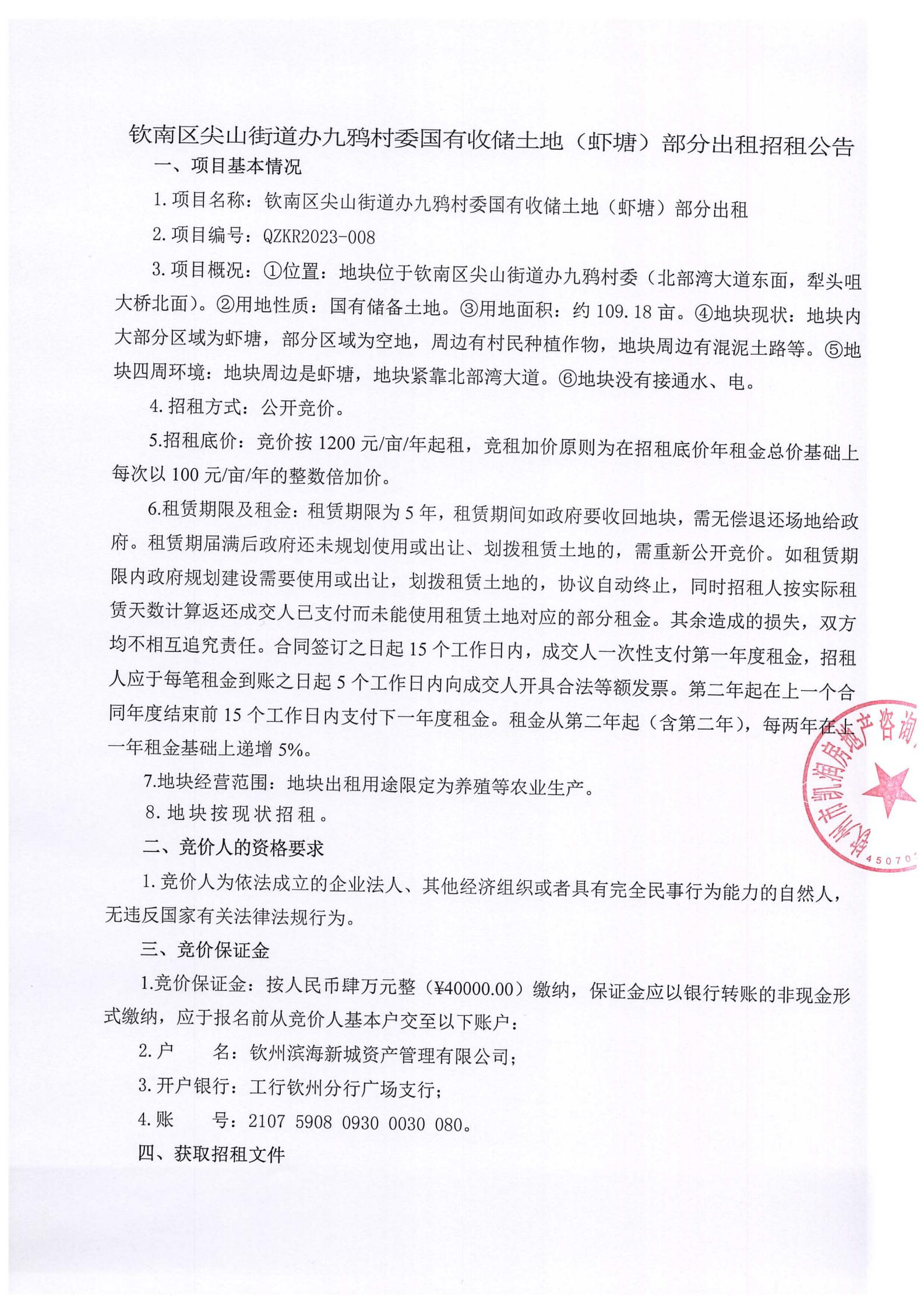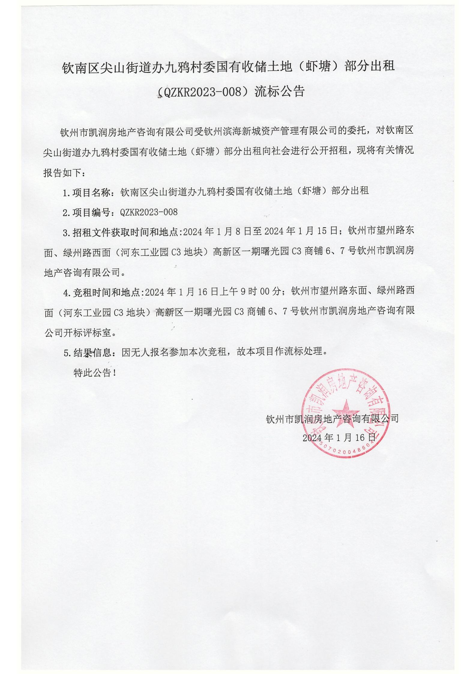 欽南區(qū)尖山街道辦九鴉村委國有收儲土地(蝦塘)部分出租(QZKR2023-008)流標(biāo)公告