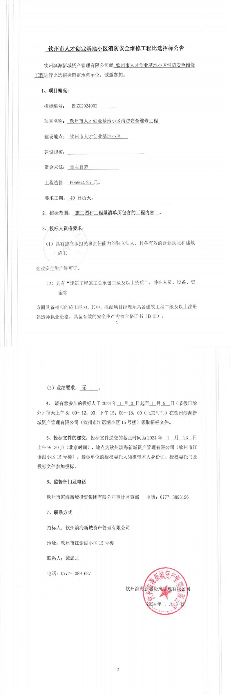 欽州市人才創(chuàng)業(yè)基地小區(qū)消防安全維修工程中標(biāo)候選人公示