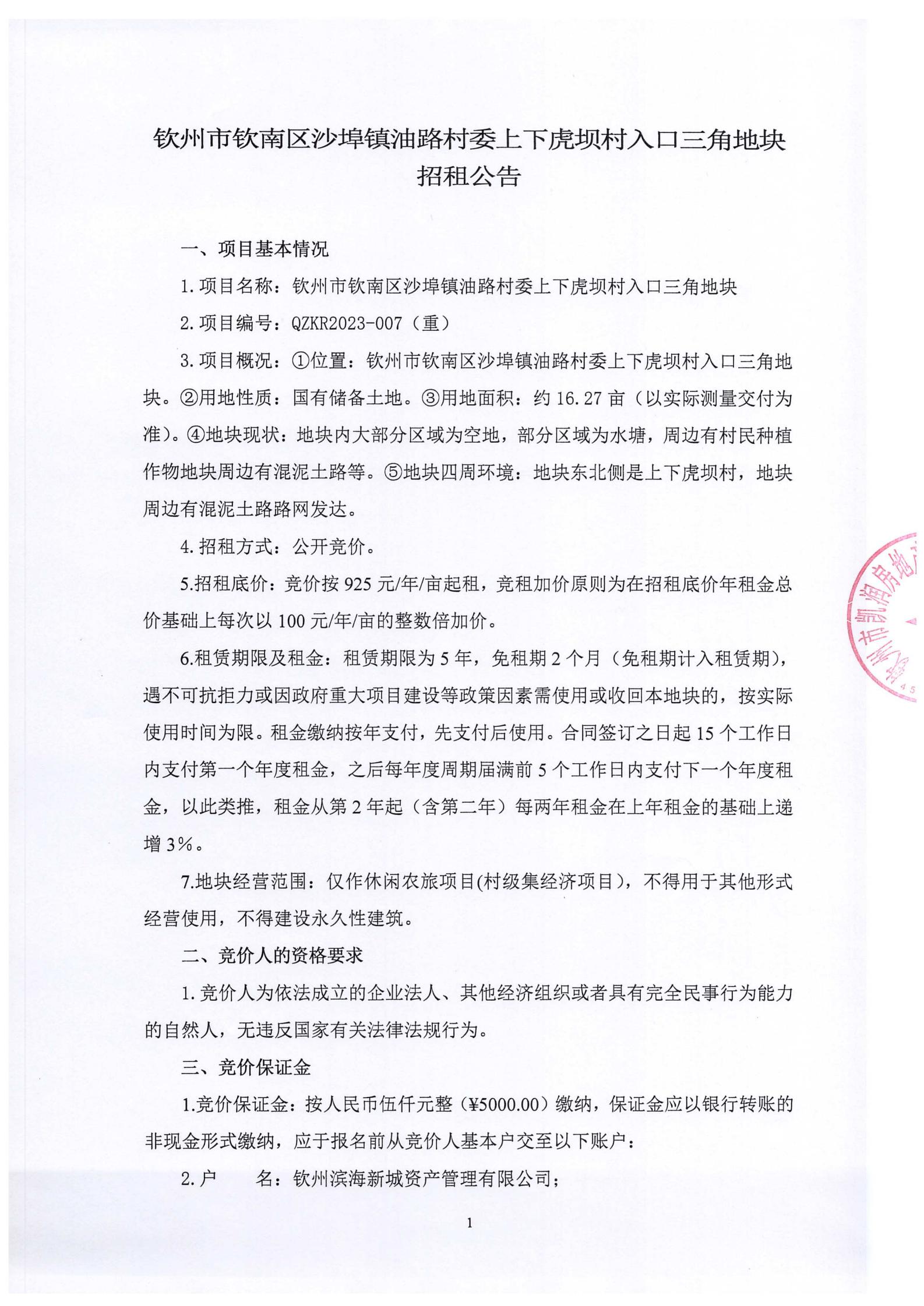 欽州市欽南區(qū)沙埠鎮(zhèn)油路村委上下虎壩村入口三角地塊招租公告