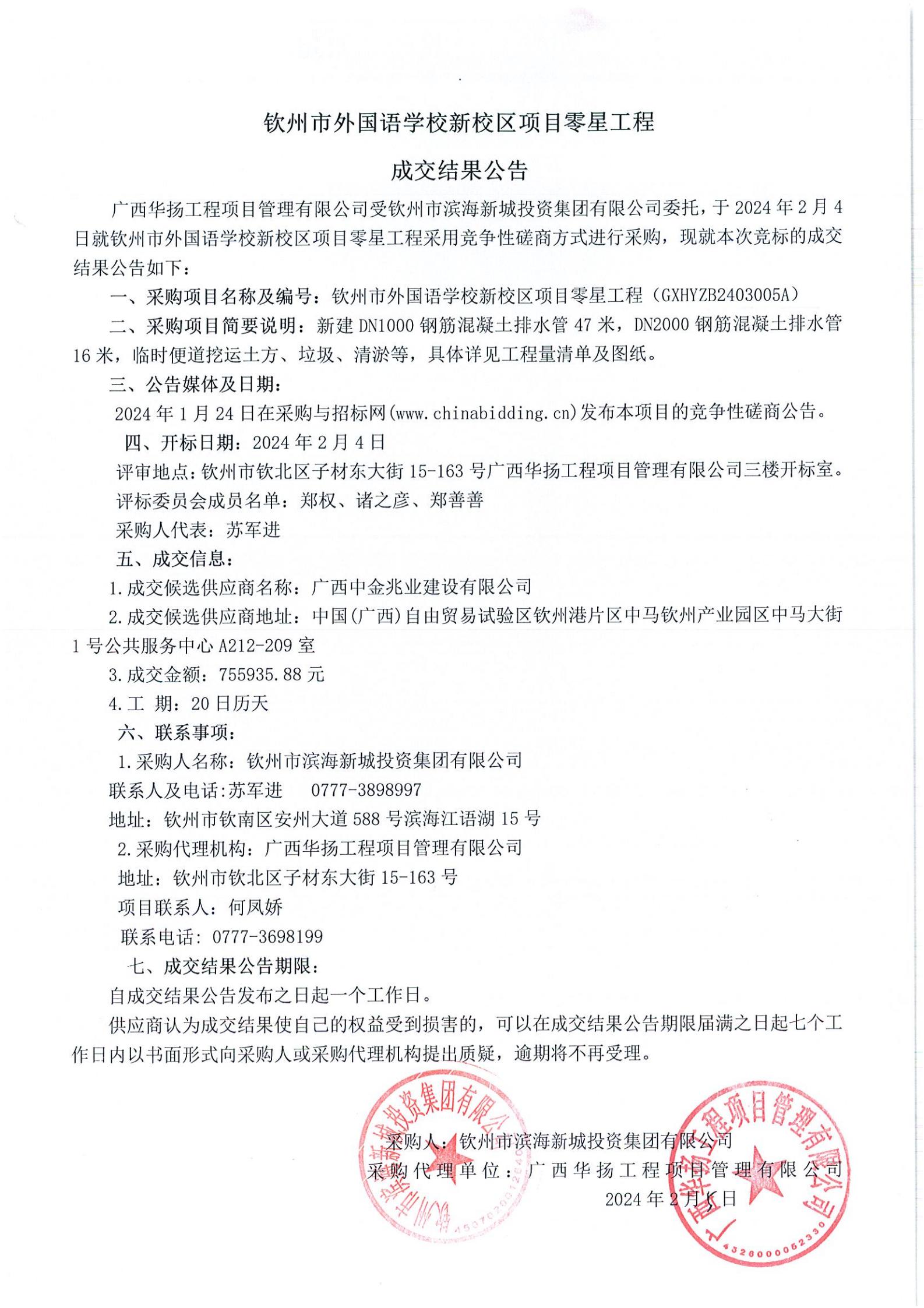欽州市外國語學(xué)校新校區(qū)零星工程成交結(jié)果公告