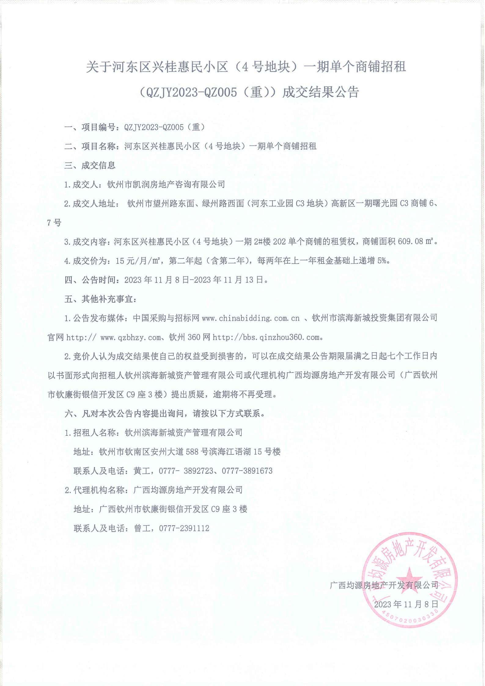 河東區(qū)興桂惠民小區(qū)(4號地塊)一期單個商鋪招租(qzjy2023-qz005(重))成交結果公告