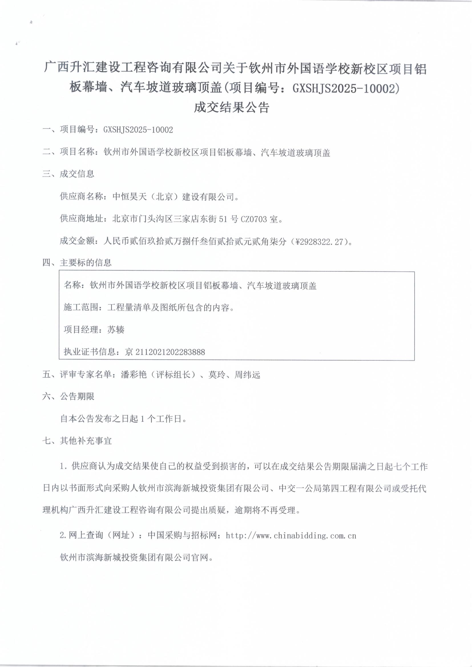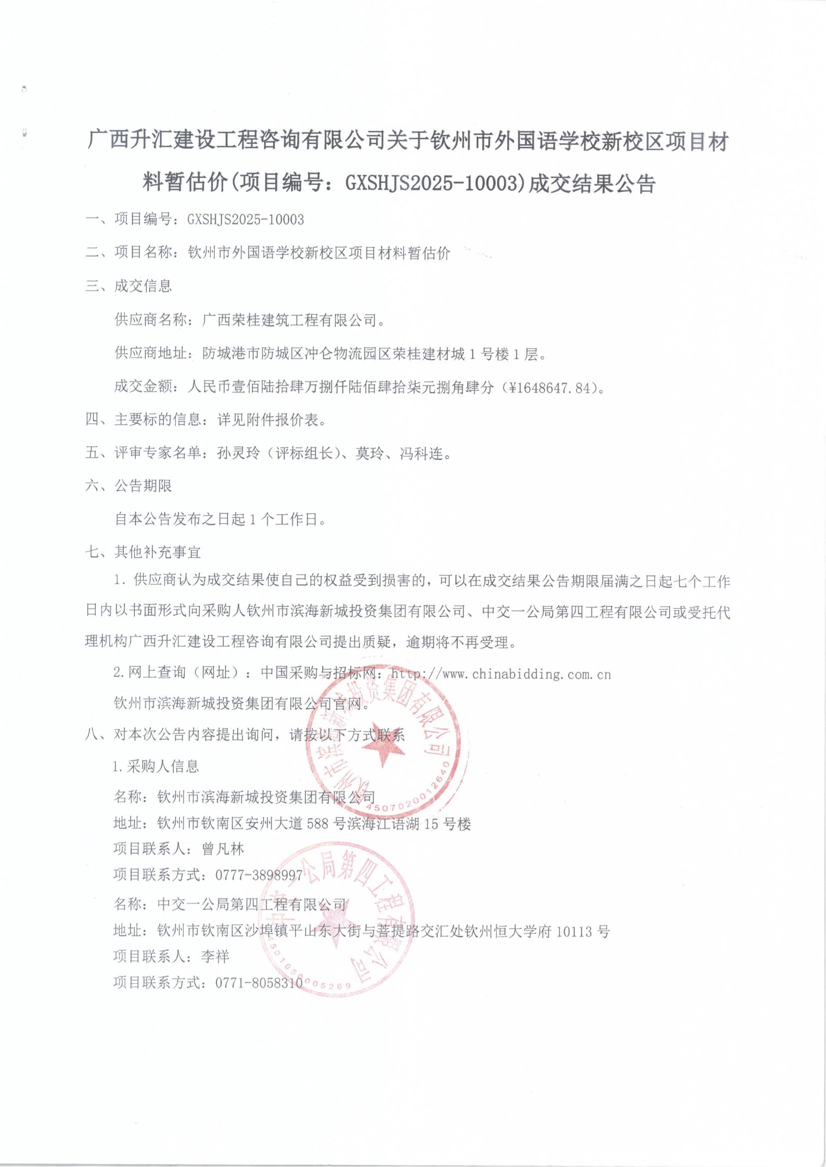 成交結(jié)果公告(欽州市外國語學(xué)校新校區(qū)項(xiàng)目材料暫估價(jià))
