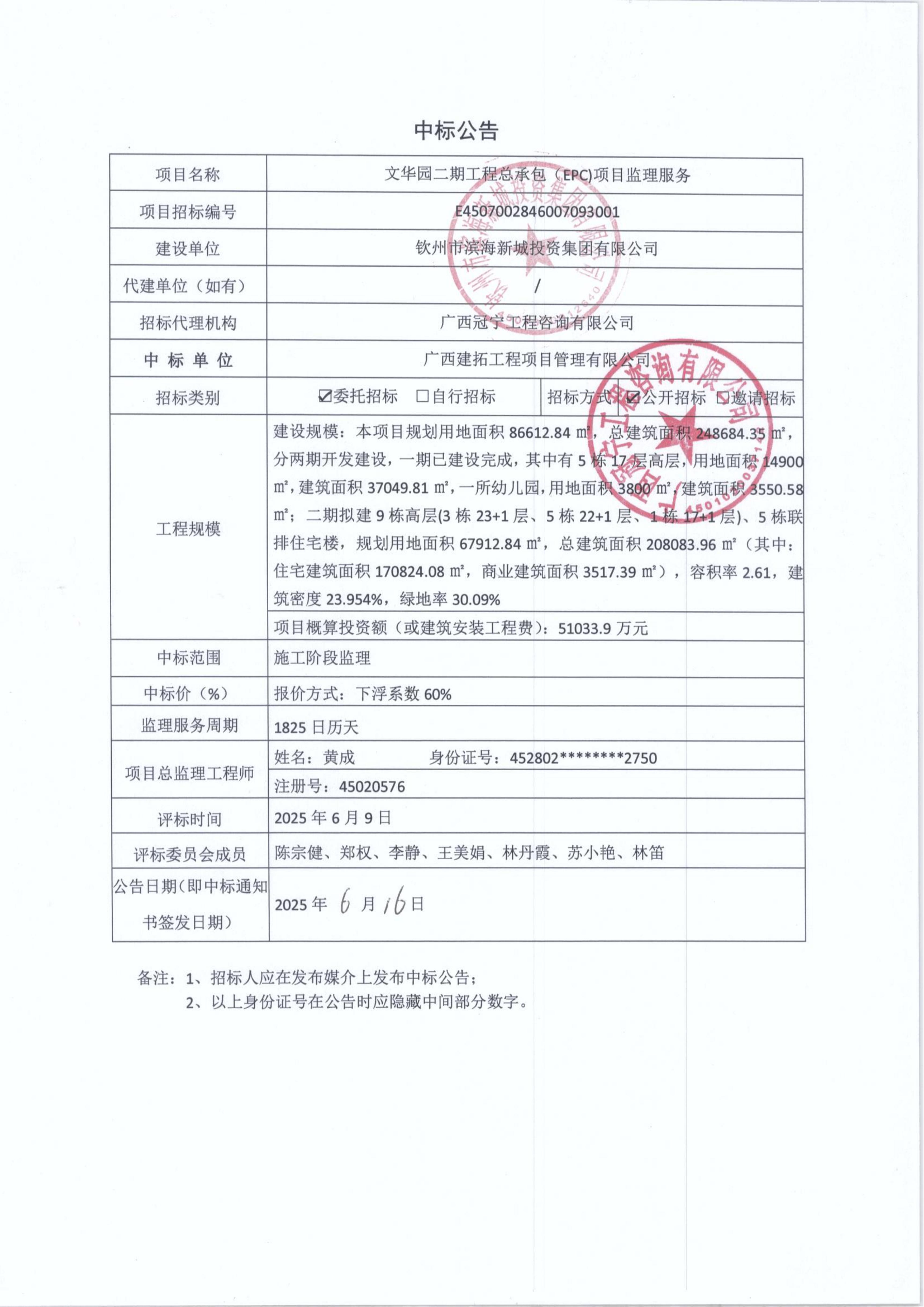 中標(biāo)公告文華園二期工程總承包(EPC)項(xiàng)目監(jiān)理服務(wù)