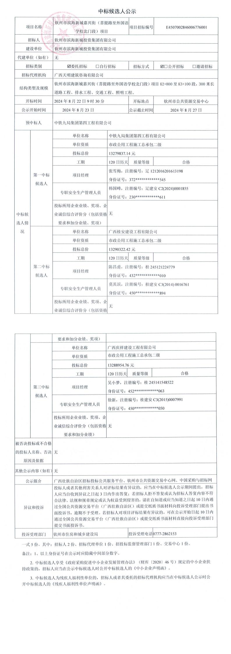 欽州市濱海新城嘉興街(菩提路至外國語學校北門段)項目中標候選人公示