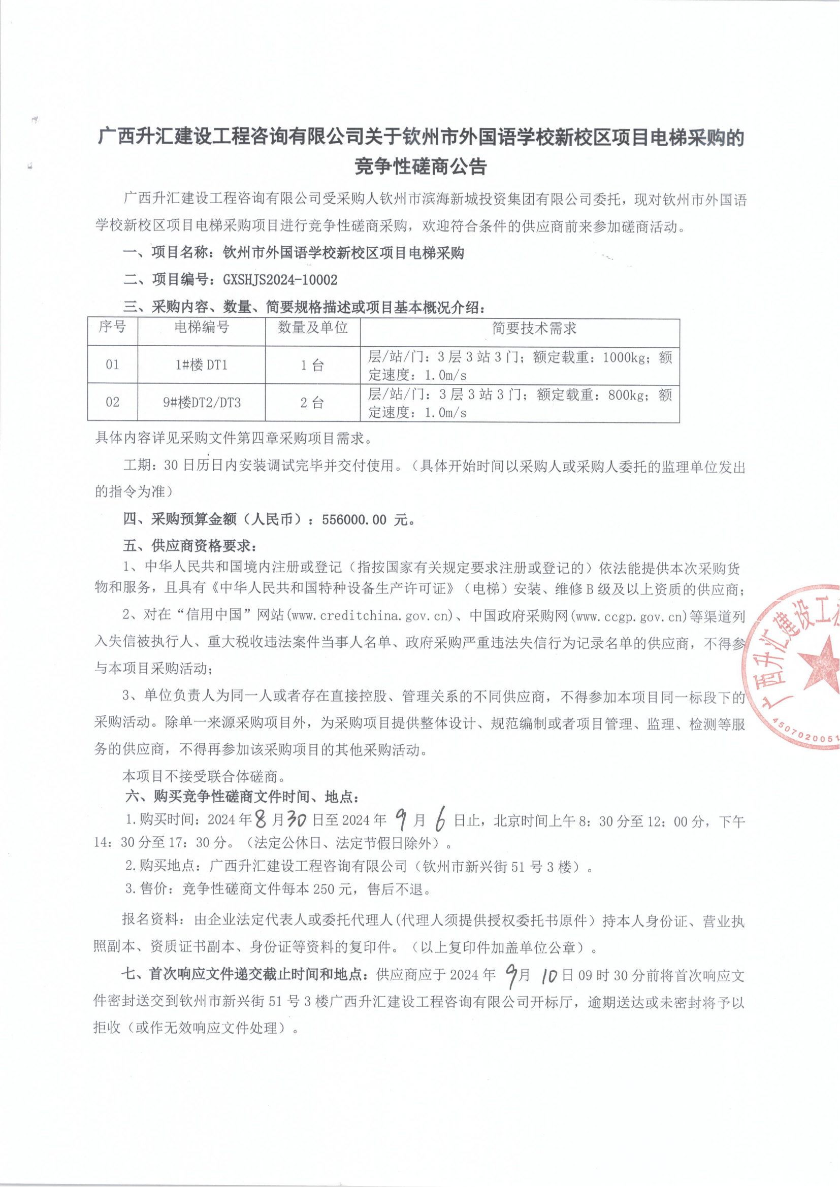 廣西升匯建設(shè)工程咨詢有限公司關(guān)于欽州市外國語學校新校區(qū)項目電梯采購的競爭性磋商公告