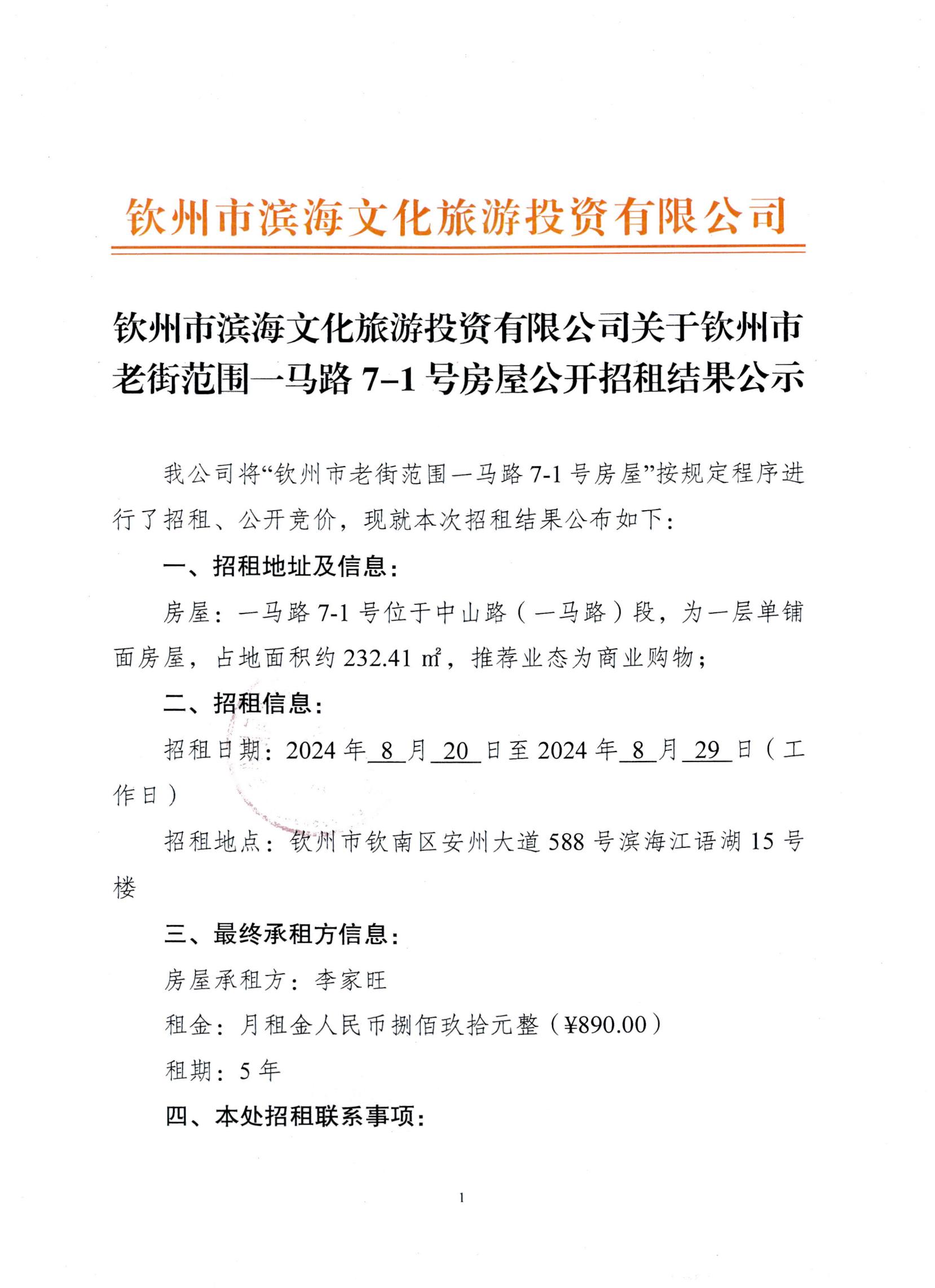 關(guān)于欽州市老街范圍一馬路7-1號房屋公開招租結(jié)果公示
