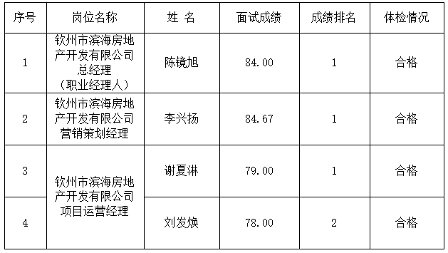 根據(jù)集團(tuán)公司2024年8月13日發(fā)布的《欽州市濱海新城投資集團(tuán)有限公司招聘公告》,經(jīng)報(bào)名、資格審查、面試、考察、體檢等程序,經(jīng)集團(tuán)公司黨委研究決定,現(xiàn)對(duì)欽州市濱海房地產(chǎn)開發(fā)有限公司總經(jīng)理(職業(yè)經(jīng)理人)、營(yíng)銷策劃經(jīng)理及項(xiàng)目運(yùn)營(yíng)經(jīng)理3個(gè)崗位擬聘用人選予以公示。