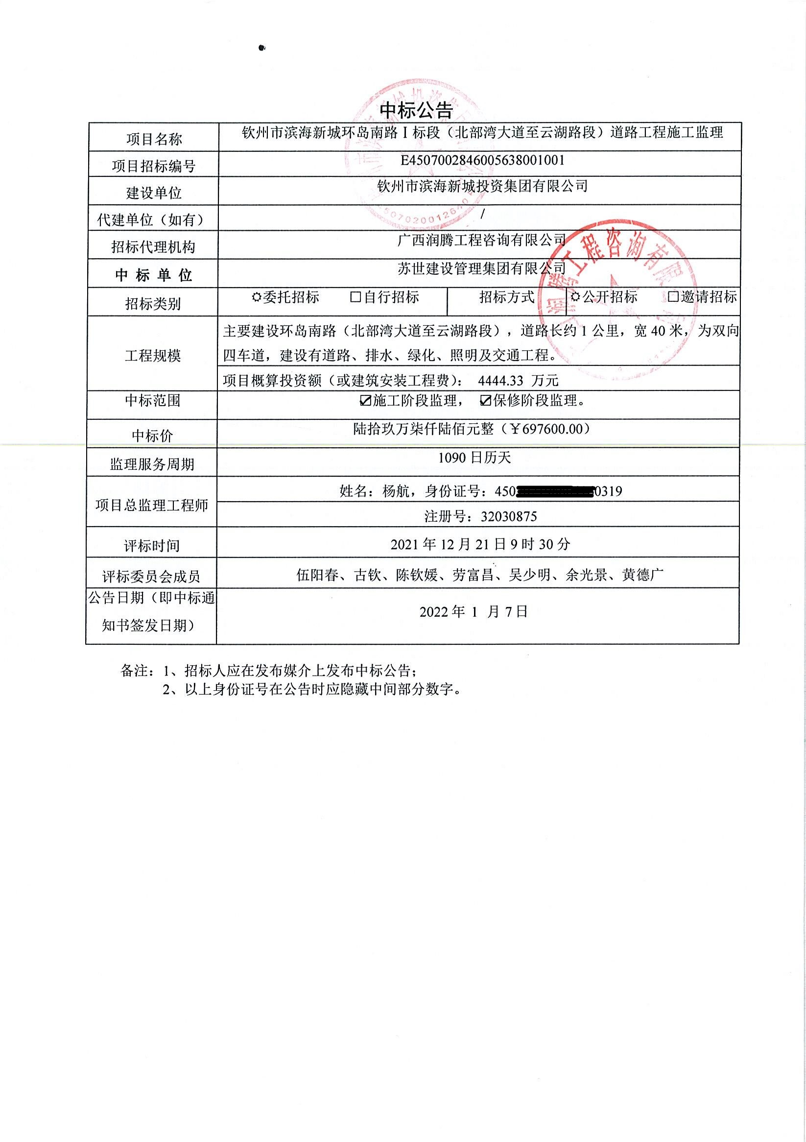 中標公示-欽州市濱海新城環(huán)島南路Ⅰ標段(北部灣大道至云湖路段)道路工程施工監(jiān)理