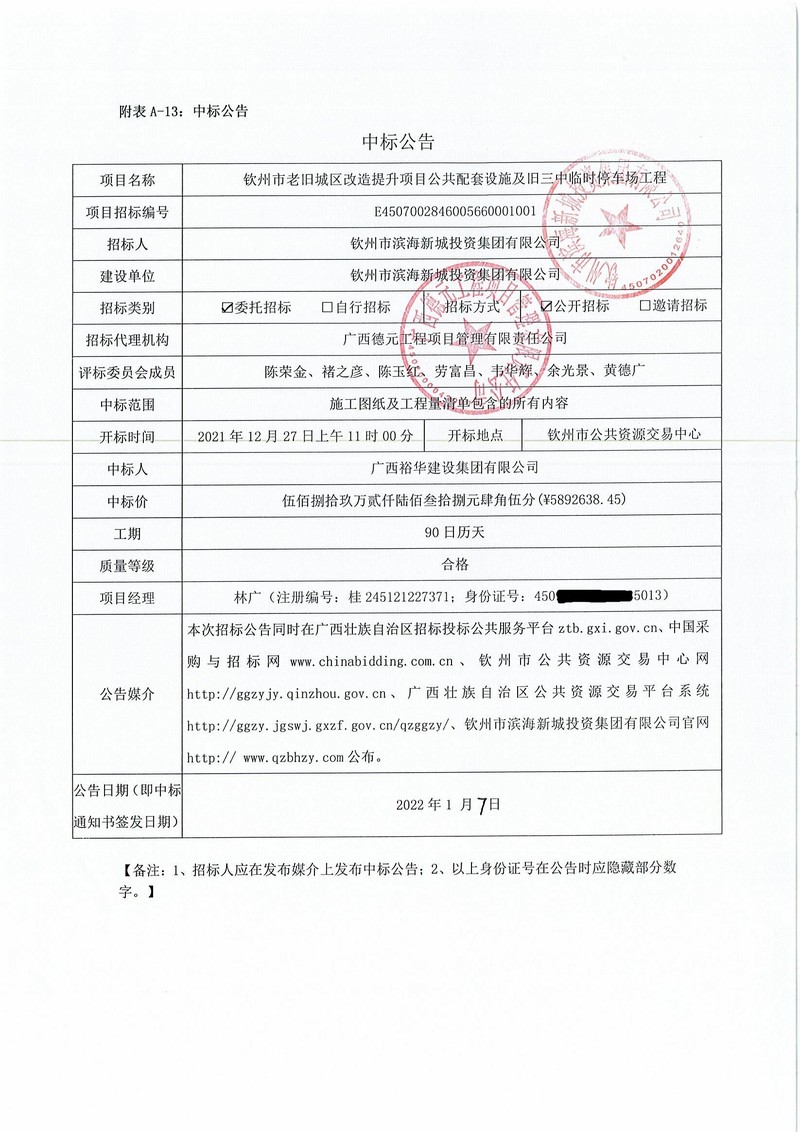 中標公告-欽州市老舊城區(qū)改造提升項目公共配套設施及舊三中臨時停車場工程