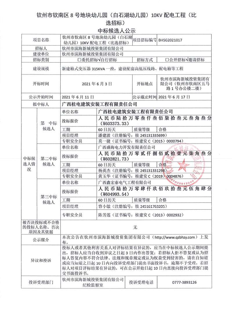 欽州市欽南區(qū)8號(hào)地塊幼兒園(白石湖幼兒園)10KV配電工程中標(biāo)公示