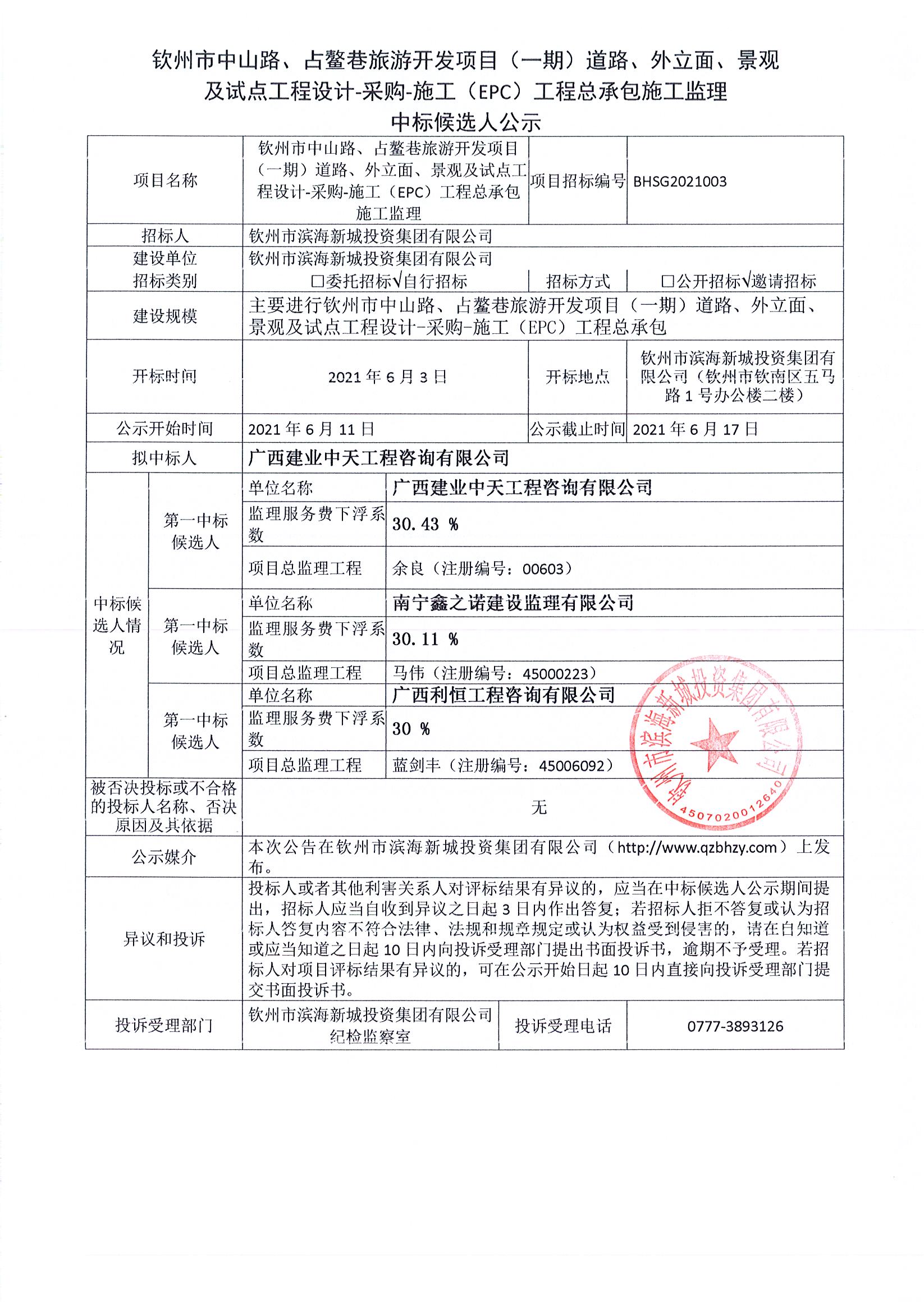 欽州市中山路、占鰲巷旅游開(kāi)發(fā)項(xiàng)目(一期)道路、外立面、景觀及試點(diǎn)工程設(shè)計(jì)-采購(gòu)-施工總承包監(jiān)理中標(biāo)公示