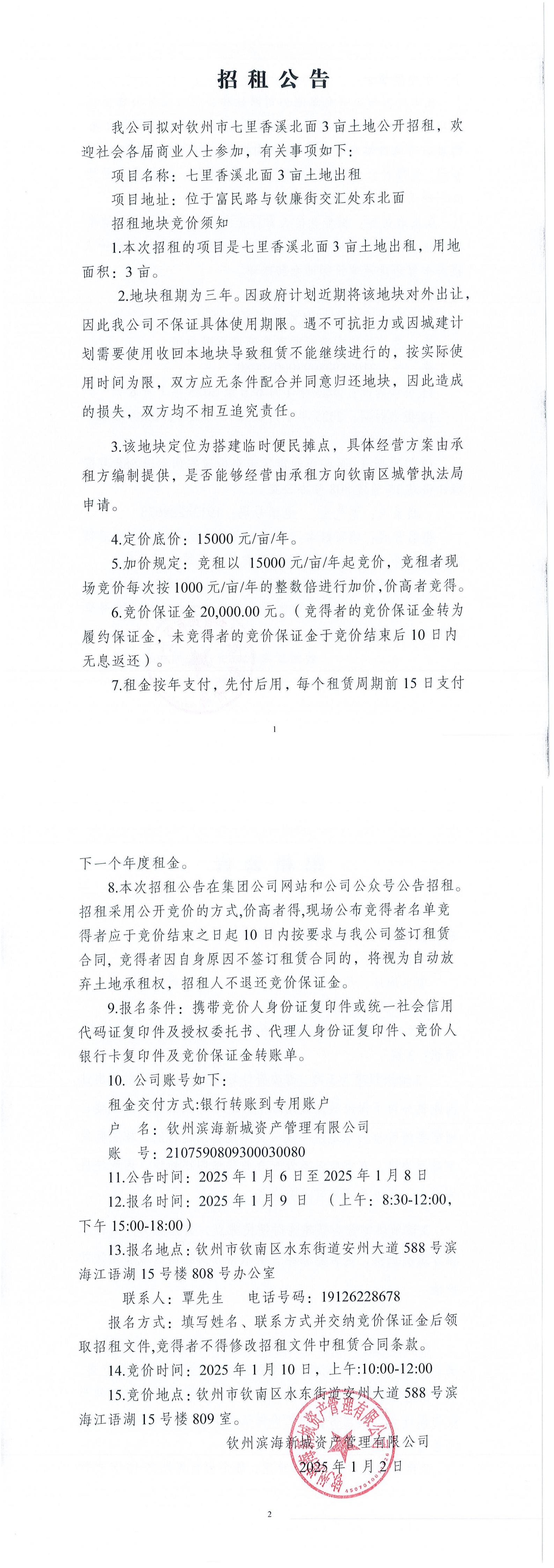 招租公告(欽州市七里香溪北面3畝土地)