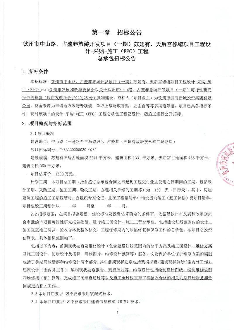 欽州市中山路、占鰲巷旅游開發(fā)項目(一期)蘇廷有、天后宮修繕項目工程設(shè)計-采購-施工(EPC)工程總承包招標(biāo)公告